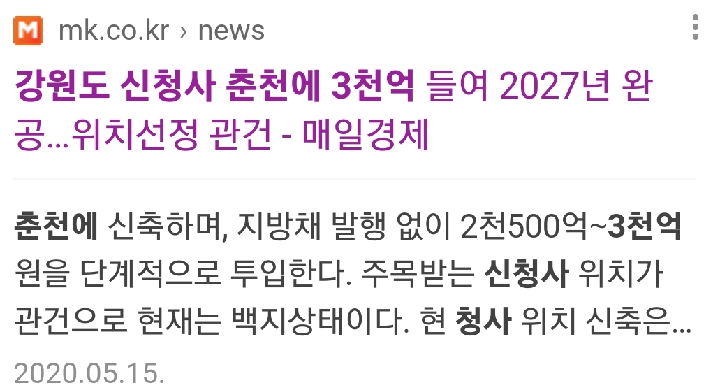 그럼 강원도는 정말 그정도의 여유도 없었던 것일까? 그렇지않은 것같다. 강원도는 멀쩡한 도청사를 춘천에 3천억을 들여 빚(지방채 발행)없이 새로 짓겠다고 하는 중이다.