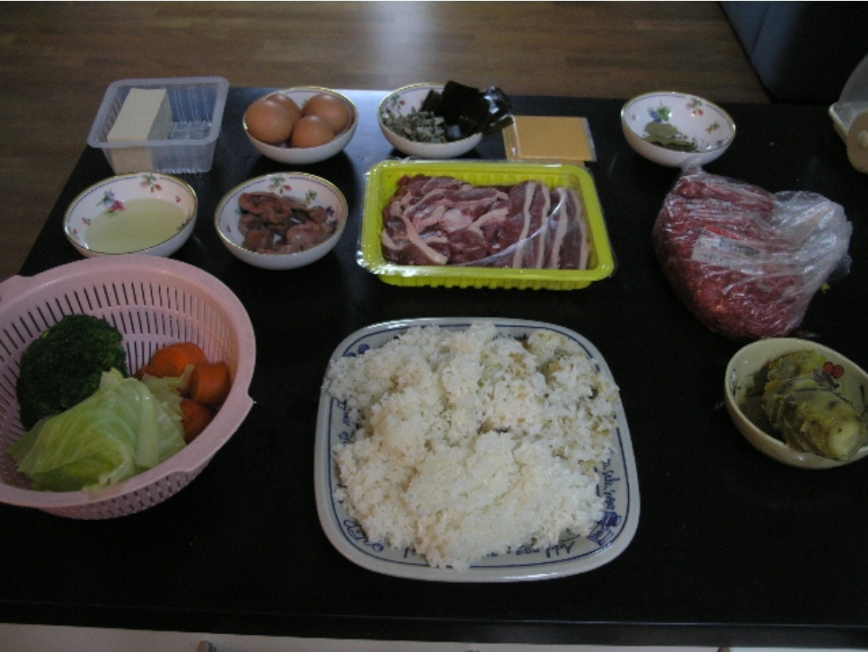 윗줄 좌측부터 두부 100g,계란 깨끗하게 씻은 껍질채 4알,소금기뺀 멸치와 다시마,치즈 3장,올리브등 허브 약간,아랫 줄에 불포화지방산이 가장 많은 카놀라유,닭 똥집 6개,오리고기 500g,소고기 1,000g 맨아래줄에는 양배추 ,당근,브로커리(익힌것 합해서 600g),밥 1,000g,고구마 1개100g입니다